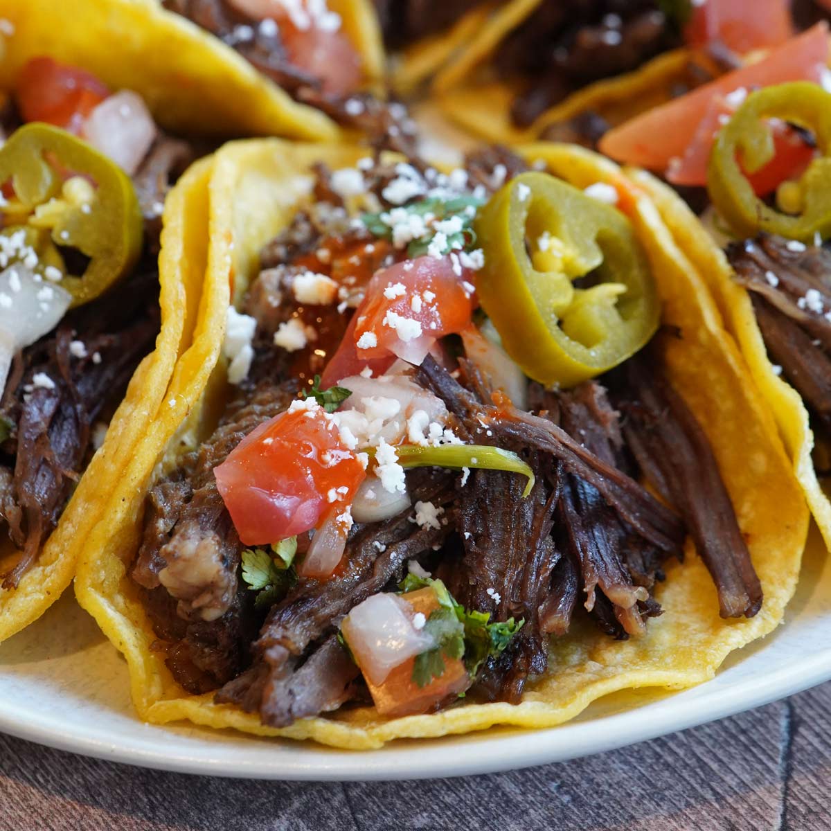 Heat the corn tortillas on a pan with a bit of oil to soften them. Add as much shredded beef as you like, then add other toppings, like pico de gallo, sour cream, and hot sauce.